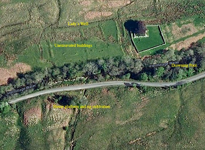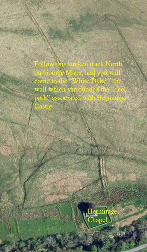 Here is the chapel just to the west of Hermitage Castle. The “Lady’s Well” is more ore less where marked, but so overgrown that I fell into it last time I was down there!
