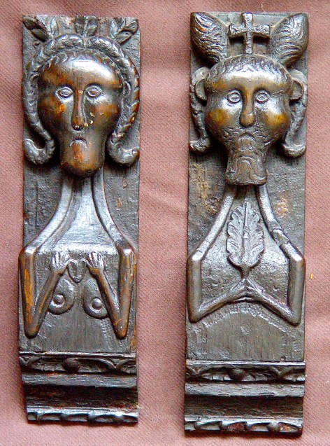 What are we to make of this pair? A naked lady wearing three leaves on her head, and clasping a heart between her hands, and a bearded man holding an (oak?) leaf, and crowned with a Christian cross and what appear to be a pair of asses ears…..