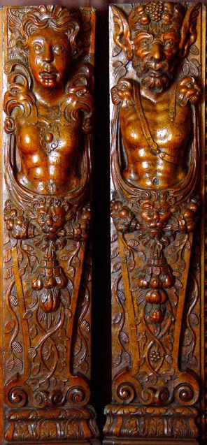 ….The carvings appear to be fragments of a court cupboard probably dating to the second quarter of the 17th century. It would be fascinating to know what the rest of the decoration consisted of.